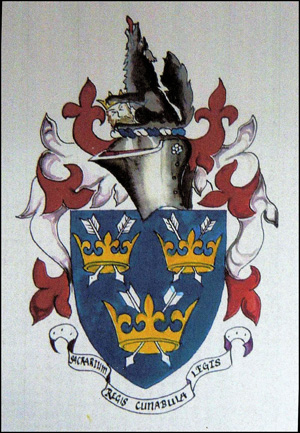 The blazon is: Azure three crowns or each enfiled by two arrows, points down, crossed in saltire argent.