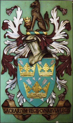 The motto is Sacrarium Regis, Cunabular Legis that is - shrine of a king, cradle of the law. Firstly, this was because the body of King Edmund had been laid to rest here and secondly, that in 1214 - at great personal peril -the Barons of England and the Archbishop of Canterbury met together, in secret, to swear on the high altar of the Abbey that they would compel King John of England to agree to the issue of Magna Carta, the document which righted many civil wrongs and became the basis of our law today.